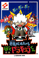 Les jeux vidéo ont le sens de l'humour, à condition, bien sûr, que ceux qui les conçoivent n'en manquent pas. Rare, Nintendo, Hudson, sont des compagnies qui font fonctionner nos muscles zygomatiques avec succès, plus, par exemple, que Capcom, Electronic Arts ou Square. Toutefois, l'éditeur qui peut se vanter d'avoir été le plus grand comique, pour ne pas dire bouffon, de ce qui correspond aujourd'hui aux années du rétrogaming, est Konami. Konami aimait tellement nous faire rire qu'ils se faisaient rire eux-mêmes en créant tous ces jeux absurdes et délirants qui parsèment leur prolifique carrière. Beaucoup de ces titres malheureusement ne sont jamais parvenus jusqu'en France, ni même jusqu'aux Etats-Unis, donnant une image beaucoup plus sérieuse de l'éditeur, qu'ils s'efforceront de vraiment devenir à l'avènement du graphisme 3-D. Il y a eu les parodies de shoot'em up avec Parodius et TwinBee, une savante konamiaiserie intitulée Wai Wai World, leurs adaptations réussies des Tiny Toons, et les deux ninja farceurs, Goemon et l'ineffable Ebisumaru. Ce dernier est un peu le symbole du rire made in Konami, il a d'ailleurs son faciès ahuri estampillé sur une pièce d'or géante dans Kid Dracula. Le jeu que nous testons aujourd'hui ne s'appelle pas vraiment Kid Dracula, son nom est beaucoup plus compliqué, Akumajou Special: Boku Dracula-kun. Adapté et traduit par nos soins, cela donne "Special Castlevania: J'chuis Dracula", car on y trouve en effet le nom japonais de Castlevania et un ton léger qui suggère la bonhomie, loin des titres déclamatoires un peu surfaits des Castlevania modernes (Dawn of Sorrow, Portrait of Ruin, ô quel lyrisme !). Il s'agit bien d'une cartouche Famicom humoristique, pas forcément si parodique, les références à Castlevania étant moins nombreuses en réalité que celles faites à Gradius dans Parodius. Toutes sont condensées dans le premier niveau, dont nous vous invitons à voir le plan dans le supplément en haut de page. Pour faire simple, nous commettrons une petite transgression et l'appellerons donc Kid Dracula, ce qui aurait sans doute été son titre s'il était sorti en France, parce que sa suite sur Game Boy, qui a elle reçu une distribution internationale, se nommait ainsi. Ce petit Dracula est évidemment un gamin vampire, qualificatif plus protocolaire que biologique puisqu'il se balade en plein jour et ne suce le sang de personne. Il ramasse quand même des coeurs, activité morbide à laquelle se livre aussi Link et bien d'autres héros de jeux vidéo qui ne sont pas des vampires pour autant. Même sa méthode de combat est indigne de sa race puisqu'il tire des boules de feu de ses mains. Un papa vampire et une maman vaisseau spatial peut-être ? Ses attaques ressemblent en effet de manière troublante à celles d'un shoot'em up. Son tir de base peut se charger, et, après les deux premiers niveaux, il en reçoit de nouveaux qu'on sélectionne avec Select, des "homing no tama" (japonglais pour boules à tête chercheuse) et un tir explosif. Konami a du mal à se débarrasser des habitudes prises avec Gradius. Heureusement, un peu plus loin, on nous offre finalement des pouvoirs spéciaux, l'un d'eux permet de se transformer en chauve-souris, ce qui est le moins que l'on puisse attendre d'un vampire, tandis que l'autre permet de marcher au plafond. Tous deux sont limités en temps mais sont néanmoins plutôt cool. Avec sa coupe de cheveux hirsute digne de Sangoku, ses yeux plissés comme un renard rusé, ses souliers vernis et ses culottes courtes à bretelles, Kid Dracula ne ressemble pas vraiment à son père, dont il ne porte que la cape de velours. Car, d'après le scénario, ce gamin est bien le fils du comte. S'il sort de son cercueil, c'est pour aller botter l'arrière-train d'une bande de vilains à face de dino ressemblant quelque peu au King Drool de PC Kid et menés par un certain Garamoth. Il y a neuf niveaux à traverser et tous seront très familiers aux fans de plates-formes. Après le château de Castlevania qui ouvre le jeu, on se retrouve dans un second niveau perché dans les nuages. Lui succède un niveau aquatique, un autre enneigé, puis une ville, un désert, un bref passage dans l'espace, un bâteau volant, et on termine par un neuvième stage futuriste. Curieusement, les niveaux de Kid Dracula évoquent moins les productions Konami que celles de Capcom et Nintendo. A certains moments on a du mal à s'empêcher de penser à Mega Man ou à Duck Tales, voire même aux environnements de Super Mario Bros. 2 et 3. Passé le premier niveau, on ne pense en tous cas plus du tout à Castlevania. Malgré sa créativité, ces "souvenirs venus d'ailleurs" occasionnent une petite gêne; on ressent un manque de personnalité que le graphisme inférieur aux productions sus-citées n'aide pas à atténuer. Il y a toutefois des moments de grâce, comme le cinquième niveau, la métropole. On ne tarde pas à s'en rendre compte, il s'agit d'une ville américaine, on y croise tout ce que l'esprit d'un public étranger abreuvé de culture populaire et en proie à un délire hallucinatoire aurait pu y caser: des extra-terrestres à grosse tête tombant de minuscules ovnis, un homme-araignée bondissant, un King Kong de la taille d'un singe lançant des avions miniatures, le tueur de Vendredi 13 arpentant le métro (décidément, il aura inspiré du monde) et un boss pas comme les autres. Ce n'est rien de moins que la Statue de la Liberté qui vous attend au bout du niveau, et, plutôt que de taper sur sa tête de métal, c'est elle qui pose sur la tête de Kid Dracula le chapeau de l'oncle Sam pour vous obliger à participer à un quiz, tout en japonais, sous la bannière étoilée. Une idée loufoque dont Konami se sert aussi dans Goemon. Des jeux, on en trouve aussi entre chaque niveau, animés par un présentateur à la coiffure changeante. Tout ennemi pulvérisé par le tir chargé laisse derrière lui une pièc