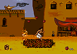 Lorsque, au début des années 90, le bon génie apparut à monsieur Disney (err... Jeffrey Katzenberg à l'époque ?) après qu'il eût frotté sa lampe de bureau, il lui proposa bien sûr d'exaucer trois voeux. Voici ce que Jeff lui répondit: "mon premier voeu est de faire un super film d'animation, mon second voeu est de faire un excellent jeu Super Nintendo, et enfin mon troisième voeu, est de faire un magnifique jeu Megadrive." Alors le génie frappa dans ses mains et dit: "Alakazam ! Tes trois voeux seront exaucés. Tu feras Aladdin." Et les bons génies n'ont qu'une parole. Ainsi vit le jour sous la houlette de Disney Interactive, un an après le film et un peu avant la version Super Nintendo, l'un des meilleurs jeux de la Megadrive et, à plus d'un titre, l'un de ses plus beaux joyaux. Aladdin, comme film, est une fomidable réussite des studios d'animation Disney et peut-être leur meilleur travail de la période contemporaine. Aladdin, le jeu, lui tient la dragée haute et, plus remarquable encore, c'est visuellement qu'il se rapproche le plus du film. Virgin et Disney ont fait un travail tout bonnement ahurissant, réussissant à donner au jeu une animation de dessin animé et ce, bien avant que The Legend of Zelda: The Wind Waker soit né et que 3D et cel-shading s'en mêlent. A l'instar de ce dernier toutefois, ce sont les personnages et toutes leurs actions qui sont le plus impressionnant, et les mouvements du héros en particulier. Quelle que soit l'action que Aladdin effectue, celle-ci est restituée par de nombreuses images, en sorte que ses mouvements sont très décomposés et fluides. En faisant la pause plusieurs fois durant un mouvement tel qu'un saut ou un coup d'épée, on s'en rend bien compte puisqu'on obtient des postures très différentes. On peut aussi bien le voir en grimpant une corde petit à petit. De plus, le choix même des gestes est vivement influencé par les professionnels de chez Disney. Quand Aladdin regarde en l'air ou quand il se baisse par exemple, ses positions sont plus emphatiques que dans un jeu vidéo ordinaire, plus vivantes. Et il y a de quoi faire, car Aladdin a beaucoup de mouvements différents; tous ceux liés aux commandes bien sûr, comme courir, frapper, sauter, pousser un objet, etc. mais aussi de nombreux extras, dont la plupart des autres jeux ne se soucient pas, comme par exemple quand Aladdin frappe suspendu à une corde, quand il tombe et atterrit d'une certaine hauteur, ou quand il attend, qu'il s'arrête brusquement, etc. D'autres jeux bien sûr proposent des animations fluides tels que Flashback, mais le personnage n'est jamais aussi clair et distinct, ni les animations aussi belles et plus vraies que nature. C'est d'autant plus étonnant que les ennemis sont aussi bien animés, même si chez eux évidemment, la palette de mouvements est plus restreinte. Les différents types de combattants, qu'ils utilisent un cimeterre, des couteaux ou un bâton, bougent de façon aussi parfaite qu'Aladdin et sont amusants à regarder, exactement dans l'esprit du dessin animé. Rien que les mains qui jettent des poteries par la fenêtre, un ennemi en soi assez secondaire, roulent leurs bras comme une divinité hindou. Les ennemis ont même parfois quelques animations supplémentaires pour le plaisir, comme lorsque les soldats se brûlent le pied sur les braises ou qu'un coup de sabre bien placé dévoile le caleçon d'un garde. Si les personnages volent le devant de la scène au niveau de l'animation, le reste est loin d'être négligé. Certains éléments bénéficient aussi de ce soin maniaque que ce soit les animaux, les objets qui se brisent, le rayonnement de surfaces brillantes, tous les effets fumigènes, etc. Un objet aussi insignifiant qu'une barre accrochée au mur sur laquelle Aladdin rebondit, vibre avec un réalisme désarmant. Comble de leur hardiesse, les programmeurs se sont même permis d'ajouter des scrolling parallaxes pour le désert et le ciel, des premiers plans savamment contruits dans le niveau Sultan's Dungeon, sans parler de la vitesse extatique de Rug Ride, la fuite en tapis volant au-dessus de la lave. Un pareil résultat ne serait pas possible sans une raison particulière et justement, il y en a plusieurs. Pour donner à la Megadrive une animation qui ferait rougir de honte une Neo Geo, Virgin avait trois atout majeurs dans sa manche. Le premier, ce fut de bénéficier du concours de Disney dans la réalisation de ce jeu; sans eux un tel travail n'aurait pas pu se réaliser, c'est certain. Le second avantage est d'avoir eu une grosse équipe d'animateurs, et sans doute justement des pros de chez Disney. Dans le générique, on compte entre autres deux groupes de huit animateurs, ce qui est bien plus que dans n'importe quel jeu, où il n'y a d'ailleurs pas toujours quelqu'un spécifiquement en charge de l'animation. Enfin, le dernier atout, et peut-être le plus déterminant, est que le jeu est dirigé et programmé par David Perry. C'est lui également qui a conçu le formidable moteur d'animation. David Perry, tout véritable fan de jeux vidéo sur consoles connaît son nom, c'est l'un de ces rares talents qui est parvenu à se faire connaître autant que ses jeux. C'est justement Aladdin qui a été le succès qui l'a définitivement lancé, et les raisons en sont évidentes quand on voit la qualité phénoménale du travail fourni et l'importance de son rôle. Après son travail avec Virgin, il a monté sa propre boîte et a développé le ver de terre le plus célèbre de l'univers, Earthworm Jim, et de nombreux autres jeux sur tous supports tels que MDK sur Dreamcast, ou dernièrement Enter the Matrix. Bref, toutes les circonstances étaient favorables pour faire d'Aladdin un prodige et un méga-hit. Si l'on a vu à quel point l'animation, superbe, permettait de restituer fidèlement l'atmosphère du film, il faut bien noter que ce n'est pas le seul élément qui sert à s'immerger dans cette excel