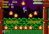 Le docteur Ivo Robotnik se verrait bien au coeur d'une nouvelle révolution industrielle, il a d'ailleurs commencé à changer les gentils petits animaux tout mignons en vilains robots tout mignons quand même (qui a dit que Sonic c'est plus "adulte" que Mario ?). Mais Sonic le hérisson qui court à la vitesse super lui-même ne voit pas les choses de la même façon, il s'élance pour délivrer ses amis de la mécanisation, faire sa fête au vil docteur et ramasser si possible quelques émeraudes chaos. Sonic The Hedgehog a beau être un jeu de plate-forme, il ne ressemble pas à Mario. Sega a clairement tout fait pour s'éloigner de cette présence trop écrasante et créer son propre style plate-forme. Cela concerne autant les éléments d'importance (personnages, graphismes...) que les détails (les niveaux s'appellent zones, le temps limite de 10 mn démarre à zéro...). Hérisson bleu en tennis dessiné avec le coup de crayon acéré du manga, Sonic adore courir à une vitesse vertigineuse. Une pression sur le bas durant une course et le voici qui se roule en boule, rapide et destructrice puisque capable de briser les murs dissimulant des passages secrets. La mascotte de Sega se veut cool, elle a un look moderne et va très vite. Le design avant-gardiste s'applique aussi aux niveaux et aux animaux robotisés. Ils ont un style bien particulier, unique, le style Sonic tout simplement. Rien à voir par exemple avec les robots "animaloïdes" de Megaman X. Tout comme les ennemis, les décors ont de fausses allures de dessins 3D qui leur donnent un look là encore résolument original, à l'instar de ces fameuses textures en damier qui sont quasiment devenues une marque de fabrique Sega, on les retrouve encore aujourd'hui dans Super Monkey Ball par exemple. Cependant cet aspect particulier peut autant être une source d'admiration que de désenchantement. Avec le temps, Sega aura adopté des graphismes plus traditionnels comme on peut le voir dans Sonic Adventure. A vous de juger lesquels vous préférez ! Six niveaux chacun divisé en trois zones s'offrent à Sonic. Chaque fin de niveau se conclue par une apparition de l'ovoïde Dr. Robotnik qu'il faut défaire pour libérer d'innocentes bêbêtes d'une vilaine machine. Dans les zones, la collecte des anneaux s'impose puisqu'ils font office de protection, tant que vous en avez vous ne mourrez pas (sauf lors d'une chute) mais le moindre contact désagréable et tous vos anneaux s'éparpillent violemment. Il est possible de les récupérer, en se dépêchant puisqu'ils disparaissent rapidement. En terminant la zone avec 50 de ces bijoux en poche, un anneau géant apparaît en fin de parcours. Sauter dedans conduit Sonic dans un niveau bonus animé d'une rotation du plus bel effet dans lequel, outre d'accumuler des points et gagner une vie, il a une chance de trouver des émeraudes chaos convoitées par le docteur. Franchir tout cela n'est pas aisé, plus du fait de l'absence de continue (il y a quand même moyen d'en gagner) et du nombre restreint de vies qu'en raison de difficultés insurmontables. Bien sûr c'est un beau challenge mais la frustration de mourir au dernier boss après avoir traversé dix-huit niveaux a de quoi exaspérer. D'un point de vue technique, l'arrangement des obstacles dans les niveaux est assez bien pensé. Il y a de l'espace, les environnements sont grands, plusieurs chemins disposés en étages sont proposés et quelques raffinements de casse-tête plate-formesque sont là. Mais ils ont aussi des défauts qui peuvent nuire au fun. La vélocité de Sonic se marie mal à des phases de plates-formes qui demandent une approche plus posée. Plus on avance dans le jeu, plus le sprint se révèle dangereux car les situations périlleuses se multiplient. A certaines occasions s'ajoute une maniabilité frustrante, les commandes sont soit trop sensibles, soit énervantes au possible comme lorsqu'on tente de sauter dans une pente. Les zones d'un même niveau manquent également de diversité, il n'y a guère de surprises et tout se ressemble, au point qu'on se sent souvent perdu: on est quelque part dans le niveau, on sait qu'on doit aller à droite, c'est tout. Un sentiment pas très agréable. Plus satisfaisantes sont les musiques qui collent bien à l'ambiance. Jolies quoique répétitives, dotées de quelques sonorités qui évoquent parfois la pop nippone, elles sont mémorables à l'exemple du thème. Les bruitages sont eux aussi sympa et typiques du genre, les bruits de bumpers et de ressorts sont bien rendus. Excepté les critiques formulées ci-dessus, la maniabilité se classe plutôt parmi les points positifs. C'est un plaisir en effet de faire courir Sonic, plaisir qui ne s'est d'ailleurs jamais perdu, qu'il y ait beau avoir 120 bits d'écart entre les consoles. Autre catégorie en sa faveur, l'animation. La course de Sonic est décomposée en de multiples mouvements et l'écran file au turbo sans jamais ralentir, la cerise sur le gâteau étant les quelques effets visuels inédits pour une Megadrive. Alors finalement, qu'on aime ou non le style Sonic, on ne peut en tous cas pas reprocher à ce tout premier épisode de ne pas exploiter la console, ni de manquer d'originalité. C'est sans aucun doute cette marginalité vis à vis des autres et des Mario en particulier qui en a fait sa force et la raison pour laquelle dans le coeur de certains il reste le meilleur. S'attaquer à un genre établi et y imposer son style, c'est ce que Sega a fait avec Sonic et parvient encore à faire avec Shenmue. le 15 décembre 2001 par sanjuro Jeu testé en version française