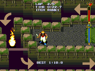 Vous devez amener Efreet dans la piste au centre et dès que le chrono est lancé, réaliser 5 tours de piste en moins d'une minute dix pour obtenir le grand prix (item rank 1). Efreet se déplace en se servant de son attaque boule de feu, deux pressions sur A en gardant la dernière enfoncée et en bougeant Ali pour déterminer sa trajectoire. Beaucoup plus facile à dire qu'à faire ! Vous avez besoin d'un timing d'enfer.