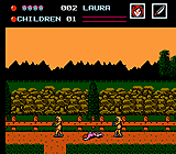 Un film d'horreur, connu pour son tueur particulièrement vicieux, sur NES ! On aura décidément tout vu sur cette console ! Surtout qu'il s'agit alors d'une série de films modernes et particulièrement dégoûtants, avec du sang, de la violence, des tripes et tout ce qu'on garde d'habitude bien enfermé à l'intérieur de soi. Et dire que des mauvaises langues accusaient les consoles Nintendo de n'accueillir que des jeux destinés aux enfants ! Clairement, ce n'est pas le public visé ici. Dites-leur que ces horribles films ont été adaptés sur NES et vous verrez leur tête ! Regardez-moi cette jaquette ! Si cela a pu avoir lieu, c'est grâce à l'éditeur défun LJN. Ce sont eux qui ont eu l'audace de... de... Oh. Je, j'ai comme une impression de déjà-vu tout d'un coup. Pas vous ? Brr, drôle de nuit. Qu'est-ce que je disais, moi ? Je ne sais plus. Vendredi 13 s'est en tout cas retrouvé sur NES et pour une surprise, c'est une surprise. Cela ne concerne évidemment que les Etats-Unis, pas de trace du jeu en Europe, ni même au Japon, mais quand même. Pour saisir l'effronterie de cette transposition, il faut déjà connaître les films. On y suit habituellement un groupe de jeunes adultes qui va se faire décimer de façon très violente par Jason Voorhees, une brute de tueur cachée derrière un masque de hockey (Ghost Face, l'assassin de Scream, aurait notre peau pour cette généralité mais passons). Il exécute sans discrimination tous les individus qui traînent dans les parages, ayant un faible pour les empalements, les égorgements, les hachages et autres joyeusetés à l'arme blanche. Au moment où le jeu débarque sur NES, en 1989, sept films sont déjà sortis en salle et un huitième est en route ! Mais les plus importants restent les trois premiers, qui ne sont pas si mauvais et posent les bases de la série. L'action, par exemple, se déroule presque toujours à Crystal Lake, une colonie de vacances isolée. Et comme le démontre le nombre de suites, Jason est increvable — son corps repose d'ailleurs au fond du dit lac, d'où il ressort à loisir. Les films étaient marquants pour la façon crue dont les meurtres étaient représentés, en plans rapprochés, à grand renfort d'effets spéciaux et de sang artificiel. Bien entendu, Jason est aussi l'inspiration du personnage de Rick dans la trilogie des Splatterhouse. Si les évènements n'ont rien à voir, le héros de Namco n'en est pas moins une copie conforme. Voilà donc en gros ce qu'est Vendredi 13 et pourquoi il est si étonnant de voir ce titre polémique sur NES. La NES n'a jamais eu de vrai Splatterhouse (juste une parodie, Wanpaku Graffiti), mais même, dans Splatterhouse, Rick tue des démons, pas des gens. Sachant tout cela, ce qui surprend immédiatement passé l'écran titre est à quel point ce qu'on voit ne ressemble pas à l'idée ou l'image qu'on a des films. Avant ça, tout va bien, on a droit à un titre en lettres rouges et à une intro flash avec le couteau dans l'orbite du masque (qui est l'affiche du quatrième film). Mais une fois dans le jeu même, on se demande si on n'est pas tombé sur une cartouche chinoise piratée, parce qu'en toute franchise, ce n'est pas comme ça qu'on s'imaginait l'adaptation de Vendredi 13, même sur NES. La campagne aux couleurs claires, les graphismes pétulants et le bonhomme en short aux articulations pliées feraient plutôt penser à un jeu de sport. Une simulation de cross-country peut-être ? Athletic World avec le Family Fun Fitness ? Non, il s'agit bien de Friday the 13th, des zombis commencent à germer. Il n'y a pas de zombis dans les films, mais au moins le lien avec les films d'horreur est fait. Ce qu'il faut toutefois noter ici, c'est qu'on parle juste de l'impression initiale. Beaucoup de testeurs américains malheureusement s'en sont tenus à elle pour porter un jugement. Les graphismes leur sont restés en travers de la gorge et leur objectivité a rendu l'âme. Friday the 13th se présente comme un jeu d'action en vue latérale mais il est en réalité plus complexe que ça. Un plan de Crystal Lake s'affiche en appuyant sur Start et ce qu'on a sous les yeux est l'intégralité de l'aire de jeu. Tous les déplacements pourtant s'effectuent par la vue classique et le scrolling horizontal. Au lieu de posséder une liberté d'exploration bi-dimensionnel comme dans Zelda, elle est en longueur uniquement, les chemins étant ensuite connectés entre eux par des points d'accès. On serait tenté de le comparer aux Chevaliers du Zodiaque, même à Metroid et Street Gangs, mais c'est plus élaboré que ça: Crystal Lake a une véritable logique 3D. C'est une caractéristique notable du jeu, que les journalistes souvent négligent. Il y a trois chemins principaux qui font chacun le tour d'une zone: l'un entoure les grottes, l'autre le lac, et le dernier fait toute la circonférence des lieux, bois inclus; les deux premiers y sont reliés par une ou plusieurs voies. En suivant ces chemins suffisamment longtemps, on tourne donc en rond: c'est ça, la logique 3D. Comme la visualisation est plate, cela ne va pas sans créer quelques soucis: sur le plan, les directions s'inversent selon où l'on se trouve sur le chemin. Comme beaucoup de choses dans ce jeu, une période d'apprentissage est nécessaire, pas parce qu'il est insalubrement mauvais comme certains aiment l'affirmer, mais parce qu'il est différent. Les deux bois et les grottes sont des zones labyrinthiques. Là aussi on tourne en rond si on reste sur le même chemin, mais ni la logique, ni le plan n'y ont plus cours. Certains objets importants y sont (parfois) cachés. Le jeu contient une bonne part de hasard, nous y reviendrons. Crystal Lake est parsemé de cabanes, les plus petites sont à l'usage des moniteurs de la colo. Ce sont eux qu'on incarne, trois hommes, trois femmes, dont on peut changer à tout moment en passant par ces abris. Chacun a ses propres caractéristiques et inventaire avec 