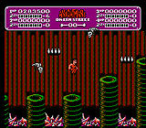 Un film d'horreur, connu pour son tueur particulièrement vicieux, sur NES ! On aura décidément tout vu sur cette console ! Surtout qu'il s'agit alors d'une série de films modernes et particulièrement dégoûtants, avec du sang, de la violence, des tripes et tout ce qu'on garde d'habitude bien enfermé à l'intérieur de soi. Et dire que des mauvaises langues accusaient les consoles Nintendo de n'accueillir que des jeux destinés aux enfants ! Clairement, ce n'est pas le public visé ici. Dites-leur que ces horribles films ont été adaptés sur NES et vous verrez leur tête ! Regardez-moi cette jaquette ! Si cela a pu avoir lieu, c'est grâce à l'éditeur défun LJN. Ce sont eux qui ont eu l'audace de... de... Oh. Je, j'ai comme une impression de déjà-vu tout d'un coup. Pas vous ? Brr, c'est étrange. Je disais donc que c'est LJN qui a eu l'audace d'adapter A Nightmare on Elm Street sur NES. Ce n'est pas la première fois qu'ils faisaient un coup pareil, un autre film d'horreur avait déjà subi le même traitement, mais... son nom m'échappe. Décidément, je ne sais pas ce qu'il m'arrive ce soir, mais je me sens tout drôle. LJN était un fabricant de jouets américain qui s'est progressivement reconverti dans le jeu vidéo jusqu'à son acquisition par Acclaim en 1990. Une de leurs spécialités sur NES était l'adaptation de films en jeux. Les premiers à y passer furent Les Dents de la mer et Karaté Kid, en 87 ! Mais LJN n'était qu'un éditeur, ils se contentaient de commercialiser les jeux, pas de les créer. Le développement était effectué par d'autres compagnies, parfois japonaises, et plus tard, par Rare. Rare avait déjà fait quelques titres pour Acclaim, dont Wizards & Warriors, et c'est sans doute suite au rapprochement de ces derniers avec LJN qu'ils se mirent aussi à faire des jeux pour eux. Pour une raison qu'on a un peu de mal à s'expliquer, aucune des adaptations de films de LJN ne connut de sortie en Europe à l'exception d'Alien 3. Même chose au Japon d'ailleurs, la majorité de leurs titres étant destinée au seul marché américain. A Nightmare on Elm Street n'est pas un nom qui est très familier aux spectateurs francophones, mais tous auront reconnu son sinistre meurtrier sur la couverture, l'abominable Freddy Krueger. En France, le premier film s'appelle Les Griffes de la nuit, et tous les suivants ont des noms différents plutôt que de suivre une numérotation. Lorsque le jeu NES sort aux Etats-Unis, cinq films ont déjà été réalisés, mais Rare choisit de ne pas s'inspirer du plus récent, lui préférant les troisième et quatrième volets, Les Griffes du cauchemar (Dream Warriors) et Le Cauchemar de Freddy (The Dream Master), beaucoup plus populaires au box office. Pour les quelques personnes sans culture ciné ou qui, cachées sous la couette, ont trop peur de regarder des films d'horreur, faisons quand même les présentations. Sans trop dévoiler ses origines, Freddy est un psychopathe décédé qui hante les songes des adolescents de son quartier. Sa chair est à nu parce qu'il a été brûlé vif, et il porte toujours à une main un gant avec de longues griffes en métal, ainsi que son éternel chapeau et pull-over à rayures. Lorsqu'il tue ses victimes en rêve, souvent de manière brutale mais originale, elles meurent pour de vrai. Il est si bon à ce petit jeu qu'il est parfois difficile de différencier le rêve de la réalité, et c'est là que les choses deviennent intéressantes et qu'on commence à flipper. Dans les films suivants, les ados apprennent à mieux contrôler leurs rêves et à se doter de pouvoirs; c'est cette idée de Dream Warriors qui est reprise dans le jeu. Rappelez-vous, il ne faut surtout pas vous endormir ou Freddy vous attrapera ! (ce n'est pas gagné avec ce test) On commence dans Elm Street, la rue où Freddy et ses victimes préférées habitent. Pour simplifier, Rare a réparti tous les principaux lieux des films, qui servent de niveaux, dans cette longue bande de scrolling. Ca pourrait passer pour un hub, un corridor de sélection des niveaux, mais en réalité, on ne peut rien choisir: il faut faire les sept dans un ordre précis. La seule variation est que l'emplacement des premiers s'intervertit. Pas bien drôle, et malheureusement, c'est l'impression qui se dégage aussi des niveaux mêmes. Ce sont généralement des bâtisses en deux ou trois parties, avec changement de décor entre et boss de fin au bout, assez courts et très classiques dans la forme: des escaliers, des plates-formes, des monstres qui font les cent pas en attendant une proie. On y ramasse peu d'objets, juste trois en fait: les os du cadavre de Freddy, qu'on est obligé de collecter pour progresser, des icônes de pouvoir pour les Dream Warriors, qui a priori n'ont aucun effet, et puis des items comme le café et la stéréo qui empêchent de dormir. A Nightmare on Elm Street a quelques idées qui lui évitent d'être catalogué comme un jeu d'action quelconque et l'une d'elles est cette notion de sommeil, tout droit venue des films. Lorsque les barres au sommet de l'écran sont épuisées, on passe de la nuit au monde des rêves par un effet de distorsion (oui, de la distorsion sur NES ! la petite imite sa grande soeur). Le graphisme s'assombrit en bleu marine et les ennemis changent, les chauves-souris et serpents typiques de jeux vidéo devenant des créatures un peu plus effrayantes. C'est aussi seulement ici que les pouvoirs des Dream Warriors peuvent être activés. En appuyant sur Select, on change d'apparence, on adopte une nouvelle identité, à la façon d'Elta ou de Mickey dans leurs jeux respectifs. On devient un athlète avec son javelot, un ninja avec ses shurikens ou un magicien avec ses sorts. Cela aide considérablement durant les combats contre les boss mais ailleurs aussi, car toutes leurs attaques sont à distance alors qu'éveillé on ne peut donner que des coups de poing ayant vraiment peu d'allonge. La b