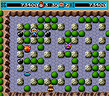 NEC Service Client International. Bonjour, comme puis-je vous aider ? Après avoir raccroché et en attendant l'arrivée prochaine de mon multitap, autant en effet commencer par le mode un joueur qui est tout de même, quoiqu'on en dise, le mode principal. L'écran titre de Bomberman est plus chargé qu'on pourrait le deviner avec cinq choix: Game Start, c'est notre mode solo, Battle, qu'on ne présente plus, Battle suivi d'une icône représentant deux consoles reliées, celui-ci c'est pour la PC Engine GT, la console portable de NEC qui n'est rien d'autre qu'une PC Engine qui tient entre les mains. Elle ne fait pas partie des consoles traitées sur le site, même si sa ludothèque est exactement la même que la PC Engine, alors nous n'évoquerons pas ce mode de jeu particulier. Enfin viennent un menu Password pour les mots de passe et un mystérieux menu Load. Sauvegarder une partie sur PC Engine était en effet assez particulier puisque, à cause du format si compressé des HuCards, il n'était pas possible d'y intégrer des composants électroniques additionels. Alors, à la place, il fallait utiliser soit la mémoire volatile du CD-Rom2 si on en possédait un, soit acheter un périphérique de sauvegarde, les backup booster de NEC ou le Ten no Koe 2 (天の声2) d'Hudson, ce dernier s'emboîtant au dos de la console. Pour ne pas pénaliser les joueurs qui n'étaient pas prêts à investir dans de tels accessoires, Hudson avait tout de même choisi de doter son jeu de mots de passe. Grand bien leur fasse ! Une brève intro résume l'objectif du mode normal: sauver la fille de l'inventeur kidnappée par le Bomberman noir. On aurait tendance à l'oublier, peut-être à cause de leur tunique de cosmonaute, mais les Bombermen sont des robots, comme Mega Man, à laquelle cette intro fait d'ailleurs penser. Le vilain rebelle se cache au sommet d'un château, séparé de Bomberman par une forêt, une rivière et d'autres environnements que notre petit bonhomme courageux devra traverser. En termes de jeu, cela ne fait pas une différence énorme, les décors changent mais tout, fondamentalement, se ressemble. Chaque niveau se découpe en huit tableaux, le dernier étant à chaque fois occupé par un boss pas toujours inédit. Au début les tableaux tiennent sur un écran, par la suite certains s'étirent dans le sens de la longueur, d'autres dans celui de la largeur, sans que leur composition ne varie: des blocs indestructibles également répartis, entourés de blocs et d'ennemis distribués aléatoirement que vous pouvez pulvériser avec vos indispensables bombes. Lorsque tous les ennemis ont été anéantis, la sortie, cachée, est activée, vous permettant d'accéder au tableau suivant. Et cela se répète sur huit terrains au long de soixante-quatre tableaux, sans jamais s'écarter d'une pouce de ce procédé. Bien sûr, il y a les bonus, toujours au nombre d'un par niveau. Outre les 1up et les rares gilets d'invincibilité permettant de nager dans le feu de ses explosions, on ramasse essentiellement des objets pour allonger la longueur des flammes, déposer plus de bombes, et réaliser ainsi de superbes enchaînements en quadrillage; d'autres encore servent à traverser des blocs ou télécommander la détonation. Sans ces deux derniers, il faut faire attention de ne pas se faire prendre par le bref retardement qui précède l'explosiondeux contractions et boom!ni de se retrouver enfermé dans un inextricable carré de terrain derrière sa propre bombe. Les monstres quant à eux ne sont pas particulièrement agressifs à part deux types, ayant la forme la plus ronde, qui vous poursuivent avec insistance. Certains peuvent aussi voler au-dessus des blocs, mais c'est une faible menace. Contrairement à ce que disait la standardiste, c'est loin d'être un mode fascinant. Pourtant, c'est bel et bien la formule de tous les jeux Bomberman sur consoles 8 et 16 bit. Il y a eu bien entendu des changements, des variantes plus ou moins ambitieuses, mais Hudson ne s'est jamais donné la peine de repenser complètement son mode principal avant d'y être obligé, dans Bomberman 64, par l'apparition de la 3D et de jeux plus complexes. Et il faut bien l'avouer, dès la toute première fois, dès le contact initial avec l'univers de Bomberman quelle que fut la console, c'était déjà un mode qui devenait vite ennuyeux, n'essayant pas de se renouveler une seule fois au cours de tous ses niveaux.