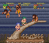 Et nous y revoilà de nouveau ! Où donc ? Mais à la préhistoire, pardi ! On l'avait laissée aux mains du FC Kid il y a un mois de ça, toute sauvage et frétillante. Elle n'a guère changé depuis, les hommes d'alors ont toujours les même passions, qui ne sont pas sans rappeler les nôtres: la bonne chère (de dinosaure !), les gros gags, la violence et les femmes. Quand ces deux derniers se rencontrent, cela a des chances de mal tourner et même de servir d'excuse à un scénario, celui de Joe & Mac par exemple. Les femmes de la tribu de nos deux éponymes ont été kidnappées par leurs voisins, des hommes de Néandertal sans scrupules, agissant apparemment pour des dinosaures à la libido trouble puisque ce sont eux qui gardent les femelles de leurs crocs aiguisés. A coups de massue, vous allez leur apprendre la galanterie. Joe & Mac - Caveman Ninja est un jeu Super Famicom de 1991, l'adaptation d'un jeu d'arcade drolatique de Data East de la même année. Tout laisse à penser que ses auteurs s'étaient dépêchés de réaliser cette conversion pour que le jeu fût disponible de bonne heure sur la 16 bits de Nintendo. Pourtant, qu'on se rassure, l'opération a été réalisée avec soin, suffisamment même pour s'approcher de l'arcade sur certains points. On pense en particulier au graphisme, certes moins dense et diversifié, mais tout de même très impressionnant compte tenu des capacités de la console. Si l'ancienneté du titre peut être ressentie dans sa jouabilité toute simple — pour ne pas dire primitive — ce n'est jamais le cas du graphisme, qui a conservé toute sa fraîcheur. Les prisonnières attendent d'être délivrées à la fin de chacun des douze niveaux que compte le jeu, ainsi que dans certains des niveaux bonus miniatures qui ont été disposés sur la carte, nouveauté de cette version console qui remplace les fins de niveaux à bifurcation de l'arcade. La présence d'un plan, comme dans Dragon's Lair, autre cartouche Super Nintendo vendue par Elite, n'était pas vraiment indispensable, pas plus que les séquences bonus en question, protégées derrière une porte fermée à clef. Elles n'offrent rien de neuf et les bonus qu'elles contiennent sont d'un intérêt limité, en sorte qu'on se passe très bien de les visiter. A part le dernier boss qui est complètement différent (un diable farceur au lieu d'un dinosaure humanoïde), on ne peut pas dire que les spécificités de cette version console soient bouleversantes. A l'inverse du jeu d'arcade qui était riche en items et attaques (il fallait constamment manger comme dans Adventure Island et on disposait de super coups dignes d'Astérix), Joe et Mac n'ont que leur gourdin assisté de quatre armes de jet pour se défendre: l'os, le boomerang, le feu et la roue de pierre, qui diffèrent en portée et en puissance, la roue fonctionnant un peu comme un missile sol-sol de shoot'em up. Du coup, l'action est beaucoup moins turbulente, ce qui bénéficie aux quelques phases de plates-formes pures. Cet avantage est quelque peu entaché par une jouabilité mal dégrossie, souffrant d'un test de collisions irritant dès qu'il fait appel à la précision, par exemple quand il s'agit d'éviter des pointes, ce qui heureusement n'arrive pas très souvent. Ils ne sont pas très acrobatiques, leurs sauts manquent de souplesse, mais bon, ce sont des hommes des cavernes et pas des ballerines, et dans l'ensemble on n'a peu de raisons de rouspéter contre eux. Le mode deux joueurs d'ailleurs a été judicieusement pensé puisqu'il existe en deux variantes, Normal et Super. Dans la première, il n'y a aucun contact possible entre Joe et Mac, alors que dans la seconde, qui correspond à la configuration de l'arcade, ils peuvent au contraire se frapper et même sauter l'un sur l'autre, ce qu'il est aussi possible d'accomplir sur les ennemis en temps normal. Il n'y a pas la richesse d'interactions que l'on trouve dans The Legend of the Mystical Ninja de Konami, par exemple, mais c'est assez pour s'amuser. Bien vu aussi, la suppression des coups liés aux projectiles, qui auraient autrement rendu ce mode "Super" super injouable. Le fait de pouvoir grimper l'un sur l'autre (pour des raisons purement pratiques, hein) permet d'en tirer certains avantages, que ce soit pour atteindre des items ou lors des combats de boss. Parlons-en des boss. Avant de pouvoir s'exclamer "I got you babe !" comme Sonny and Cher (de dinosaure !), il faut d'abord affronter ces grosses bêtes qui sont, en particulier du point de vue graphique, le pinacle du jeu. Elles ont généralement une tête énorme avec de petits yeux brillants et représentent toute une faune de créatures depuis longtemps fossilisées. La plupart ne sont pas trop dures à battre, pourvu qu'on arrive jusqu'à elles avec un nombre adéquat de vies et encore un des trois continus en poche, mais les choses ont tendance à se compliquer vers la fin, avec ce dernier niveau qui en vaut deux. Avec un camarade, on peut se livrer à une compétition de matraquage de boss, chaque coup étant crédité d'une croix verte au compte de son porteur. Le gagnant reçoit une bise de la jeune femme sauvée, qui doit beaucoup se pencher pour atteindre le visage de ces deux nabots, les joueurs les plus perspicaces en profitant pour apercevoir fugitivement l'intérieur de son décolleté. Voilà bien à quoi on reconnaît du graphisme soigné ! Les ennemis ordinaires ne sont pas en reste, notamment ces Néandertaliens au visage cerné d'un collier de barbe hirsute. Comme les têtes d'oeuf de PC Kid, jeu référence de toutes ces incursions ludico-préhistoriques, on les croise dans des occupations diverses: volant des oeufs, tentant fréquemment de vous écraser d'une grosse pierre, dévalant joyeusement les pentes roulés en boule, parfois même à bord d'un véhicule (nos ancêtres n'ont pas fait qu'inventer la roue, ils ont aussi inventé la moto !). Avec leur gros nez et leur bouche édentée, 