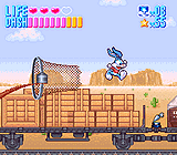 "On est p'tits et gentils, et un peu barjos aussi. L'heure enfin est arrivée d'envahir vos télés...". Si vous étiez déjà de ce monde au début des années 90, vous vous souvenez peut-être de cette chansonnette qui lançait chaque nouvel épisode des Tiny Toon. Avant les décevants Animaniacs et l'excellent Toonsylvania (qui ont eux aussi été déclinés en jeux vidéo), ces neveux de Bugs Bunny, Daffy Duck et de la grande famille des toons Warner Bros s'appropriaient le petit écran le mercredi matin pour un déluge de gags et de folie. L'adaptation par Konami de la série fut l'une des conversions les plus réussies de la Super Nintendo. Avant de jeter son dévolu sur la Playstation, Konami a signé quelques-uns des meilleurs jeux des 8 et 16 bits de Nintendo. Tiny Toon Adventures en est l'exemple parfait. Il restitue de manière remarquable l'atmosphère du dessin animé, en empruntant des centaines d'éléments et de références à de nombreux épisodes, le tout superbement mis en graphisme. Un travail d'orfèvre. Même l'humour foldingue conserve son esprit et s'y retrouve tout du long. Trois modes de difficulté sont proposés. Si le mode difficile n'offre pas de différence majeure avec le mode normal, ils sont en revanche tout deux nettement enrichis par rapport au mode facile. Les mondes s'allongent de sous-niveaux et des boss font leur apparition. Un niveau entier y est même rajouté. Ne jouer que le mode facile, c'est donc passer à côté d'une bonne partie du jeu. Buster, le p'tit lapin que vous incarnez, débute son aventure à la Loonyversité. Qui dit lapin, dit course et bond; Buster a beau être un toon, il n'échappe pas à la règle. Ce sont là ces deux meilleurs moyens de défense. Une pirouette pour mettre un ennemi K.O. et une course effrénée finissant à plat ventre pour évaporer une ligne de souris patibulaires. Courir, c'est possible en pressant R qui active la fonction "dash", bien pratique pour franchir de larges précipices ou grimper à la verticale sur des murs qui mènent on ne sait où, peut-être même jusqu'à des passages secrets. Egalement indissociable du lapin, la carotte, qui suivant sa couleur recharge ou accroît la barre d'énergie, tandis que les étoiles concèdent une vie au bout de cent récoltées. Le premier niveau est aussi le plus classique. Il permet de se familiariser avec les commandes. On y croise quand même Arnold, le chien musculeux qui agite sa torche dans les greniers de l'école. Quant au boss, ce n'est autre que Dizzy, version "tiny" du célèbre diable de Tasmanie, qu'il faut vaincre en l'aidant à se gaver de gâteaux jusqu'à ce qu'il tombe de sommeil (à la Ronflex !). Le niveau suivant se déroule au far-west. Montana Max dit Maxou, un garcon qui aime les millions et n'a rien à voir avec les sites Maxoe, cambriole un coffre sous le museau de Buster avant de s'échapper par la fenêtre du saloon. Une poursuite s'ensuit, qui conduit notre ami aux très grandes oreilles à attraper un train lancé à toute allure. Un combat l'oppose à Maxou sur une locomotive endiablée qui se décompose à la manière d'un vaisseau de R-Type, sur fond de la vigoureuse musique de Suppé. Tout ce passage du train est un modèle de vivacité, d'action et de variété. Le scrolling pousse à agir, on ne s'ennuie pas une minute. Rien de tel pour se détendre après tant d'efforts qu'un petit séjour dans une demeure hantée. Des ennemis bizarroïdes en forme de gâteaux, pas mal de phases de plates-formes, et même un peu de réflexion est requise pour activer des mécanismes à balle rebondissante, tout un programme. Une formidable musique ponctue le niveau. D'une saisissante beauté, légèrement angoissante, même de nos jours elle continue de produire son effet. Une fois encore le boss est d'une originalité frappante. Buster doit détruire la machine d'un savant fou à coups de boulons pour libérer un gentil monstre de son emprise. Retour à la Loonyversité pour un niveau à part puisqu'il s'agit d'une rencontre de football américain. On se retrouve directement à la fin du match avec pour objectif de marquer un touchdown afin de faire basculer le score à l'avantage de son équipe. Fi des règles complexes et de la stratégie assomante de ce sport brutal, le carnet de tactiques se limite à deux choix: courir avec le ballon le plus loin possible sans se faire plaquer ou attraper celui-ci après qu'un de vos co-équipiers l'a envoyé dans les airs. La vue latérale reste inchangée, mais ce n'est pas simple pour autant. Le défi est assez pimenté pour donner quelques sueurs froides. Inédit au mode facile, le niveau dans les airs est une mission confiée par P'tit Coyote dans laquelle Buster doit retrouver un objet très particulier et très important pour la suite. De quoi s'agit-il ? Il faudra jouer pour le découvrir ! Après s'être élevé dans les airs, il doit sauter de ballons en ballons dans la plus grande tradition du jeu de plates-formes. Le reste l'embarque dans un flipper géant puis dans une fuite éperdue pour échapper au scrolling qui dévore le bas de l'écran. Le final du jeu prend place dans l'espace pour une version délirante, mais ô combien réussie de Star Wars. Le premier niveau en particulier, où des croiseurs bombardent le vaisseau sur lequel Buster évolue est très impressionnant. Les personnages sont tous issus de la trilogie de George Lucas, les fameuses troupes impériales, la princesse Babs et ses inoubliables macarons, et même le terrible Duck Vador. Avec Tiny Toon, Konami signait une fois encore un jeu magistral pour la Super Nintendo. A cette époque, l'éditeur numéro 2 après Nintendo, c'était bien eux. Non content d'avoir su retranscrire à la perfection les extravagances du dessin animé, le jeu bénéficiait d'atouts considérables et parfois inattendus comme la musique, l'une des meilleures partitions de la console. Le challenge était aussi des plus appréciables, à la haut