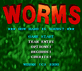 La seconde moitié des années 90 n'a pas été toujours très rose pour les jeux vidéo. L'essor de la 3D n'a pas été loin de condamner à mort la 2D, la génération Playstation a pris le pas sur la génération Nintendo-Sega, rarement pour le mieux, et les concepts, les idées, se sont rapidement mis à tourner en rond. Pourtant, il y eut encore des miracles dans ce monde en plein changement, témoin à la fois d'une aube et d'un crépuscule. En 1995 par exemple, Team17 eut un coup de génie sur 32 bits: faire de Lemmings un jeu de guerre. Worms n'est en aucune manière associé à Lemmings mais on peut difficilement le décrire plus clairement. Les bonhommes sont remplacés par des vers — qui sont censés être des lombrics mais ont plutôt des proportions d'asticots — et au lieu d'avancer vers une sortie, ils attendent le plus souvent, se dévisageant calmement pendant qu'ils réfléchissent à un moyen de faire sauter le voisin. Mais c'est surtout le design global qui évoque Lemmings, ces sprites minuscules dans un décor élaboré qui se détruit et s'effrite d'un seul tenant, battu par des flots mortels à sa base, percé de cratères d'explosion comme des trous de gruyère et grignoté de part en part comme à l'intérieur d'une fourmilière ou d'une pomme infestée de vers. La panoplie d'aptitudes en revanche est essentiellement guerrière, ce qui l'apparente plus à King Arthur's World que nous testions en début d'année. Elle est aussi plus étendue et l'on peut attaquer les autres vers de bien des façons, de près ou de loin, la victoire n'étant obtenue que par l'équipe qui seule restera debout, même s'il n'y a qu'un survivant. C'est ce principe d'équipes qui distingue sensiblement Worms des autres jeux aux troupes minuscules, car il le prive de but à long terme, de devoir venir à bout des niveaux pour finir le jeu. Worms en effet n'a pas de fin, il se joue match pour match, qu'on dispute ici en un ou deux rounds, pour le seul plaisir de la bataille. Une partie se déroule un peu comme un jeu de société ou un jeu de plateau, au tour par tour avec un temps de décision optionnel et la liberté de déplacer son pion, son ver. L'esprit de jeu du coup y est moins stressant, presque posé, et par conséquent plus convivial, caractéristique auquel il doit beaucoup de son charme. Les équipes, de deux à quatre, dirigées par des humains ou par l'ordinateur, sont chacune formées de quatre vers. Quatrains d'odes barbares que le joueur compose à coups d'explosions ! Justement, vos talents créatifs sont brièvement mis à contribution puisque l'une des petites récréations de Worms consiste à renommer ses vers. Et ceux de cette version Super Nintendo en ont bien besoin parce que ses auteurs n'ont vraiment pas été inventifs: la plupart des noms sont ceux de l'équipe de développement et de leurs amis, dont on n'a franchement que faire (sur 32 bits, il y avait par exemple les Beatles et les Chevaliers de la Table ronde). Les noms et les points de vie apparaissent au-dessus de chacun des vers durant l'affrontement et c'est ce qui rend cette opération onomastique assez rigolote. On se sent un peu plus concerné par notre ver éponyme, tout comme on espère que celui qui porte le nom d'un célèbre méchant de cinéma se montrera à la hauteur de sa réputation. (Et si la curiosité vous prend, ou si vous cherchez de l'inspiration, vous pouvez voir la liste de nos équipes en cliquant le lien ci-dessous:) Sur le champ de bataille, fini de rire. Bon, non, pas vraiment. Mais il vaut mieux quand même se concentrer car cela se joue comme un jeu de stratégie, où chaque coup est lourd de conséquence. D'ailleurs, la répartition aléatoire des vers sur le terrain influence énormément le déroulement du match: un "soldat" mal placé, trop près des bords de l'écran ou de l'eau, tout deux mortels, aura vite fait d'être éliminé. Les premiers tours ainsi sont souvent décisifs, une équipe pouvant aisément perdre la moitié de ses forces si la chance ne lui sourit pas, ceci également parce qu'on a tendance à se servir des attaques les plus puissantes, la dynamite et la frappe aérienne, dès le début. Chaque équipe joue son tour l'une après l'autre, un ver à la fois, infligeant des dégâts, subissant des pertes, tuant aussi accidentellement les siens aux mauvais hasards des tirs. Les troupes et les munitions diminuent, les pierres tombales se multiplient sur le terrain, qui, creusé par les explosions, baisse de niveau. Les puits s'élargissent jusqu'à former des îles depuis lesquelles les derniers survivants échangent des tirs à la grenade ou au bazooka, souvent les seules armes qu'il leur reste. Tous les matches ne tirent pas nécessairement autant en longueur, mais cela arrive assez souvent sur Super Nintendo à laquelle il manque certains attributs des versions 32 bits. Au niveau de l'armement par exemple, les missiles à tête chercheuse et les mines sont absents, ainsi que la corde et les poutres métalliques parmi les outils secondaires. Les mines surtout, qui créaient des réactions en chaîne plus ou moins contrôlées, changent beaucoup le gameplay. De même, certaines armes paraissent moins efficaces, comme la frappe aérienne ou les bombes à fragmentation qui se dispersent parfois curieusement, juste d'un côté sans pour autant suivre le sens du vent. La programmation est un peu moins bonne semble-t-il, il y a beaucoup de bugs dans l'IA, certains étaient déjà présents sur 32 bits mais d'autres non ou sont pires que précédemment: un ver qui pose de la dynamite près du bord de l'écran s'en éloignera en allant se suicider au dehors ! Il y a quand même un changement positif, c'est la disparition du zoom, m'as-tu-vu et somme toute inutile, qui était surtout bon à filer des maux de tête. Mais malheureusement, la perte principale est encore plus grave. Il s'agit évidemment de la baisse de la résolution, qui, au vu de l'échelle d